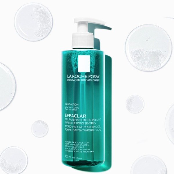 Effaclar Gel Purificante Micro-Exfoliante de La Roche-Posay, un limpiador facial y corporal diseñado para pieles grasas y con imperfecciones. Este gel ayuda a purificar la piel, desobstruir los poros, eliminar el exceso de sebo y reducir las imperfecciones persistentes, incluyendo marcas.